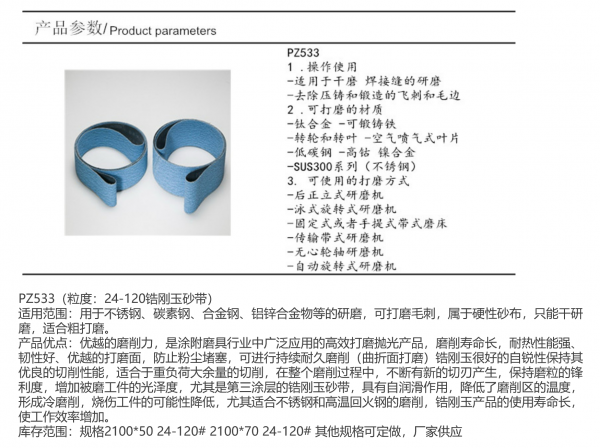 1.***铸造砂带(高尔夫球头砂带)-鹿牌PZ533(PZ528):强力聚酯布基材,锆刚玉磨料,砂面带特殊***涂层,用于打磨304号316号等特硬特韧的不锈钢、合金钢的,***用于高尔夫行业打磨球头浇口与球毛可打磨毛刺,同样适合在***铸造,厨具制造,阀门管件制造,刀剪制造等行业,属于硬性砂布,只能干研磨,***强度高,综合***!鹿牌锆刚玉砂带PZ533在广东珠海佛山江门深圳,浙江宁波杭州,福建泉州,湖南长沙常德,湖北武汉,广西南宁等地的***铸造厂及高尔夫球头企业被***使用!