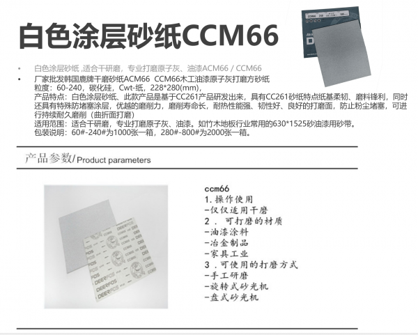 产品特点:白色涂层砂纸、此款产品是基于CC261产品研发出来,具有CC261砂纸特点纸基柔韧、磨料锋利,同时还具有特殊防堵塞涂层,优越的磨削力,磨削寿命长,耐热性能强、韧性好、良好的打磨面,防止粉尘堵塞,可进行持续耐久磨削(曲折面打磨)
